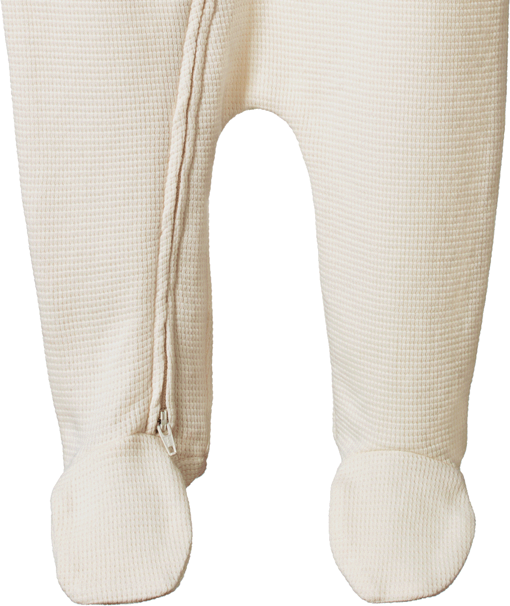 Our Dreamlands suit features a full length double ended zip for easy dressing and night-time changes. With enclosed feet to keep little one cosy overnight, in soft comfortable stretch organic waffle.